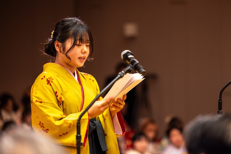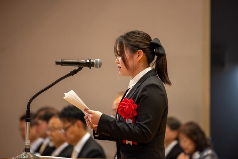 式典は、学長から卒業生代表に学位記・修了証書の授与、式辞、そしてご来賓の方々、在学生から祝辞が述べられ、在学生による学歌が式典に華を添えました。最後は卒業生代表から今までお世話になった方々に向けて「感謝のことば」が述べられました。