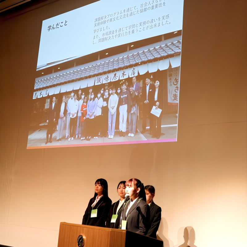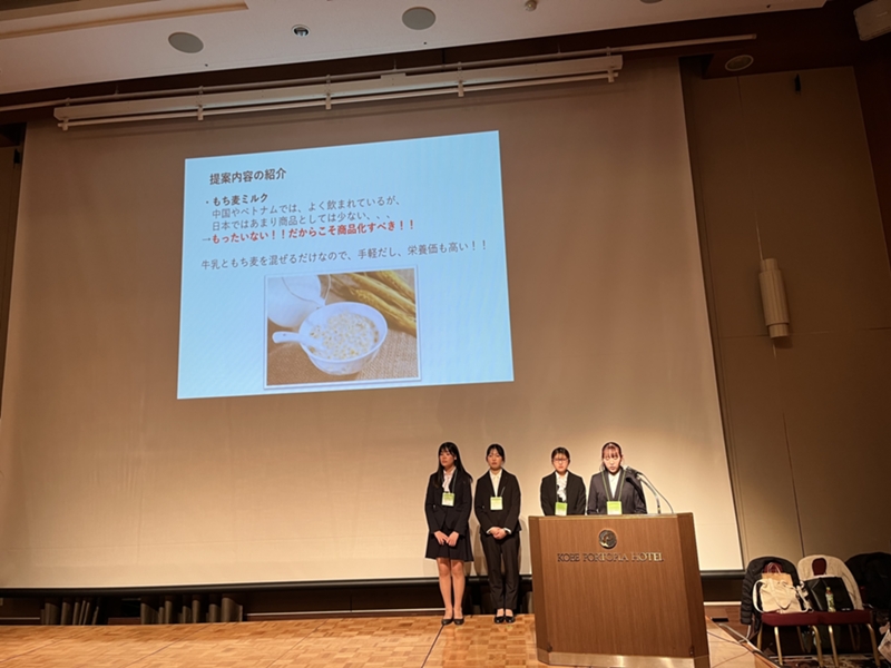 12月9日に開催された「大学コンソーシアムひょうご神戸 賛助会員と加盟校の懇親会」において、神戸親和大学文学部(国際文化学科・心理学科)の2年次生4名が「企業課題解決プログラム」の活動報告を行いました。本報告は、春学期のプロジェクトベイストラーニング基礎Bにおいて、株式会社マルヤナギ様から提示された課題「兵庫県産もち麦の認知度向上と若年層の市場開拓」に取り組んだ成果となります。